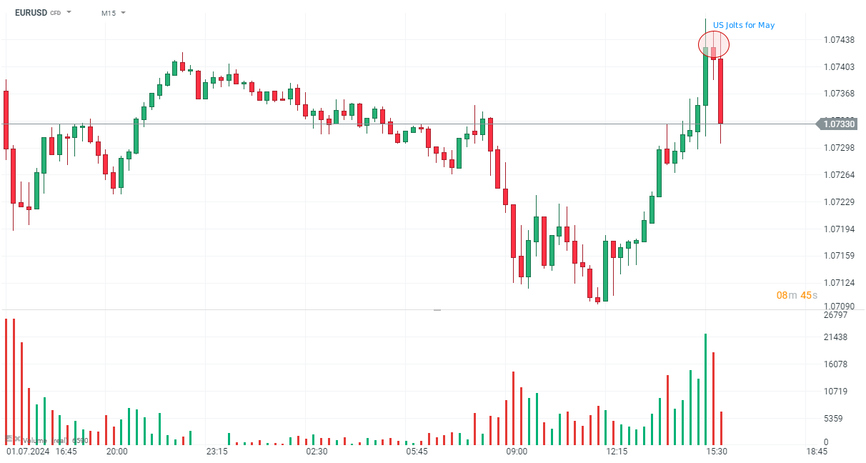 Para EURUSD notuje spadki po danych JOLTS, które pokazały wyższą, niż oczekiwano i wyższą, niż poprzednio liczbę wakatów w amerykańskiej gospodarce podczas gdy analitycy spodziewali się ich spadku.