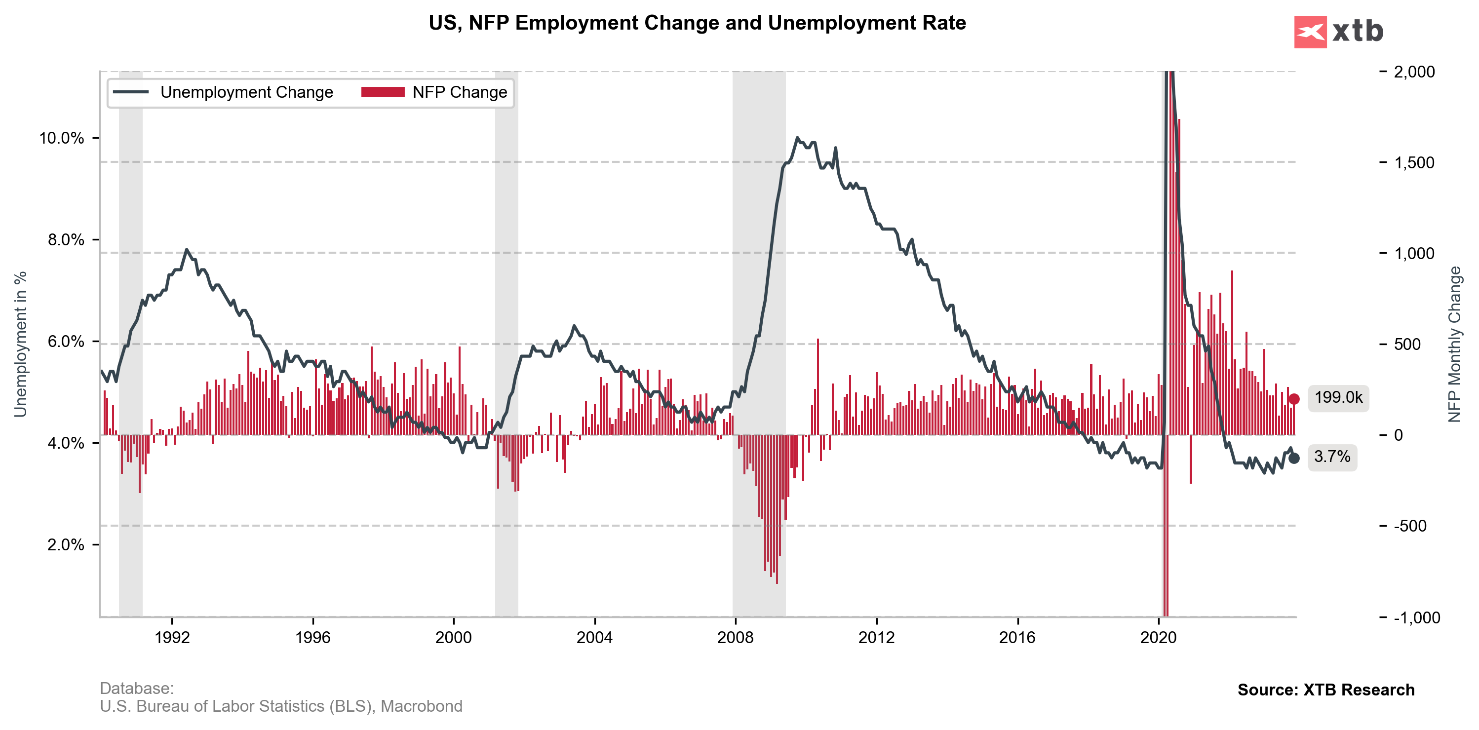 Dzisiejszy raport NFP wskazuje na siłę amerykańskiego rynku pracy. Zmiana zatrudnienia zaskakuje wyraźnie wyżej, a stop bezrobocia spada do poziomu 3,7%. W ujęciu miesięcznym mamy również wzrost płac.