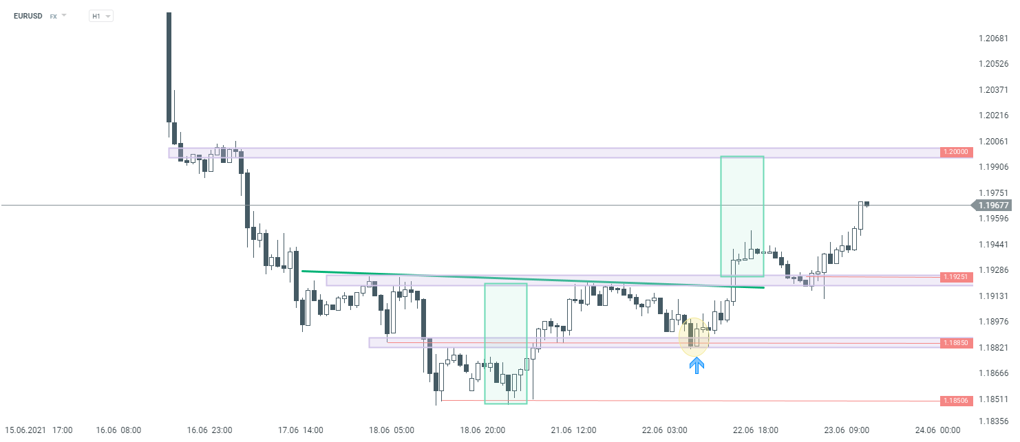 Podczas dzisiejszej sesji możemy obserwować wzrosty na EURUSD, ruch w górę jest kontynuowany po danych z USA. Źródło: xStation5