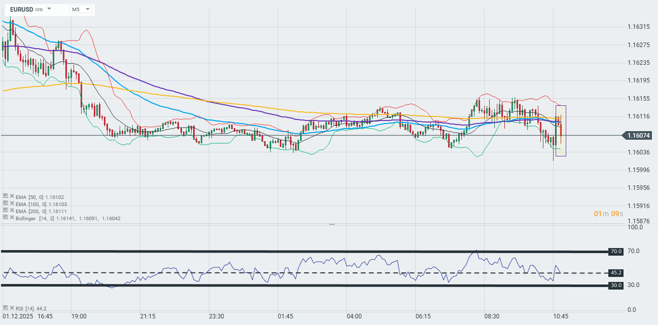 Kurs pary EURUSD lekko spada po odczycie wstępnych danych za listopad. Dane bez większego wpływu na EBC, rynki swapów nieprzerwanie wyceniają pauzę w zmianach stóp procentowych do końca roku i przez cały 2026.