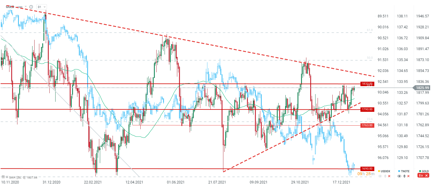 Dolar może umacniać się ze względu na to, że Amerykanie reagują na wzrost cen ograniczeniem zakupów. W takim wypadku presja na zmiany w polityce monetarnej może być większa. Jednocześnie jednak dane z perspektywy gospodarki nie należą do najlepszych. Mocny dolar może doprowadzić do tego, że złoto będzie miało problem do wybicia najbliżśzego poziomu oporu. Źródło: xStation5