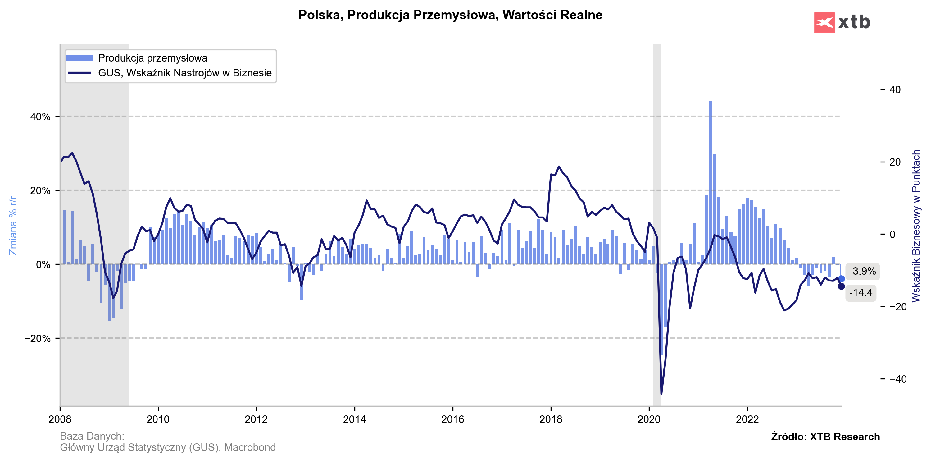 Słaba produkcja przemysłowa, choć nie spada tak mocno jak oczekiwał tego rynek. Źródło: Macrobond, XTB