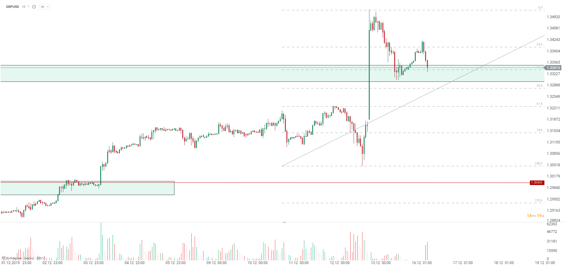 Tak słabe odczyty mogą podnieść obawy o spadek wzrostu gospodarczego w IV kwartale. Na to samo wskazuje Markit. Niemniej powinniśmy pamiętać, że w tym wypadku może nie być widać wpływu wyników ostatnich wyborów parlamentarnych. Podobnie mieliśmy również w poprzednim miesiącu, kiedy odczyty wstępne okazały się być naprawdę słabe w porównaniu do odczytów ostatecznych. Mimo to funt wyraźnie traci. Obecnie testowane jest zniesienie 38.2 ostatniego odbicia związanego z ruchem po wynikach wyborów. Kluczowy dla obrony jest poziom 1,3300.
