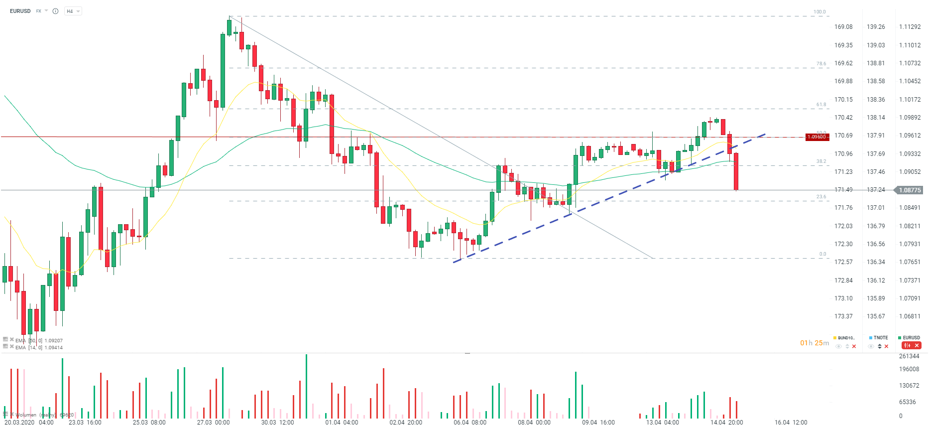 Dane o sprzedaży detalicznej w ujęciu miesięcznej zmiany w USA za marzec wypadają najgorzej w historii. W ujęciu rocznym sprzedaż spada na poziomie 6,17% r/r. Dodatkowo opublikowany indeks produkcyjny dla Nowego Jorku pokazuje drastyczny spadek do poziomu -78,2 punktów z poziomu -21,50 przy oczekiwaniu -35 punktów. Fatalne dane dzisiejszego dnia, które prowadzą do dalszych spadków kontraktów na Wall Street. Co ciekawe dolar korzysta na fali statusu "bezpiecznej przystani" i umacnia się do większości walut.