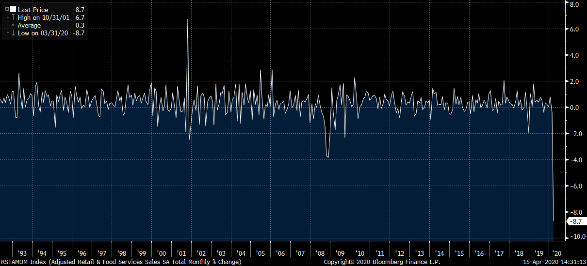 Największy miesięczny spadek sprzedaży detalicznej w historii. To oczywiście efekt zamykania placówek handlowych. Źródło: Bloomberg