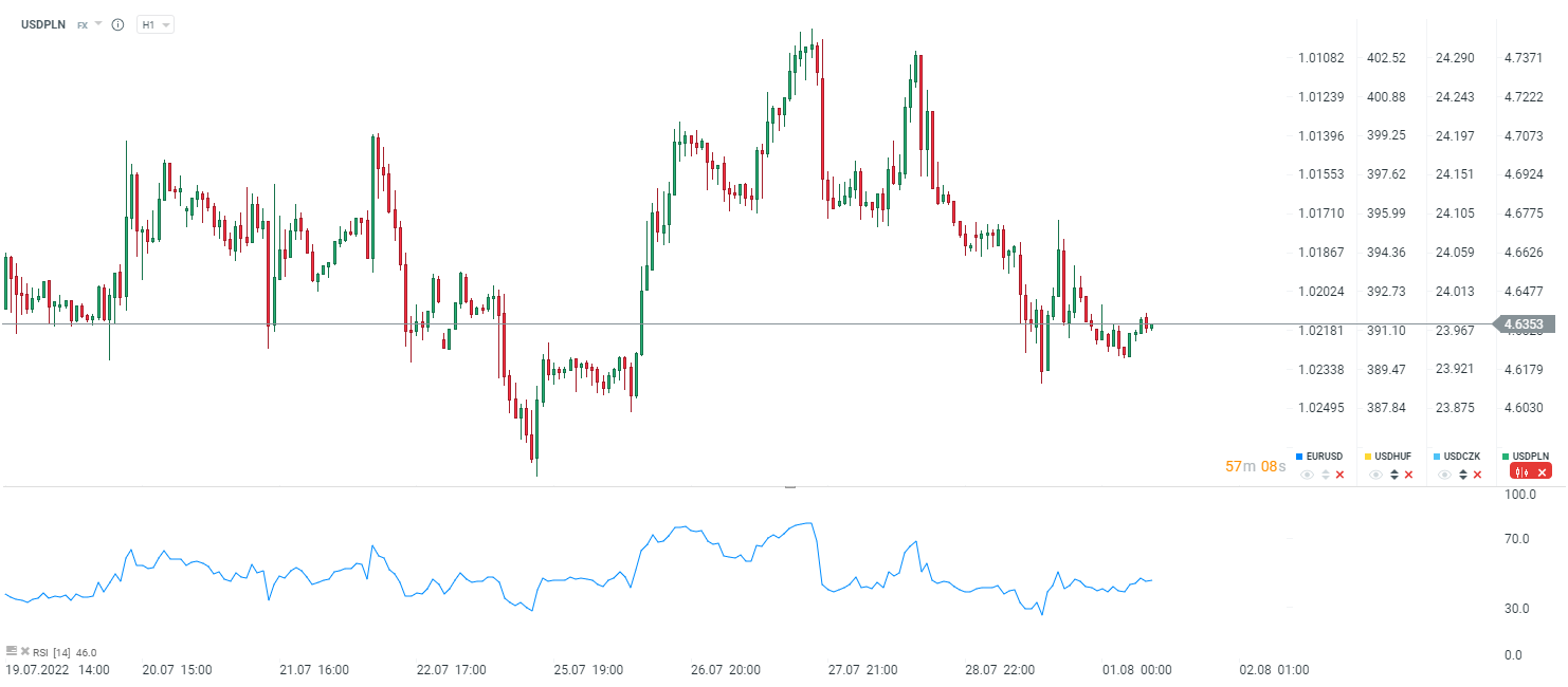 PLN nie reaguje na dzisiejsze dane. Od dwóch tygodni obserwujemy konsolidacje na polskim złotym. Źródło: xStation5