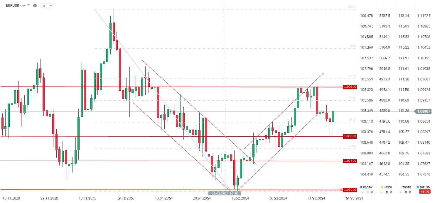 EURUSD wyraźnie zyskuje. Słabość dolara może oznaczać to, że rynek spodziewał się zmiany w komunikacie lub zmiany prognoz na bieżący rok. Źródło: xStation5