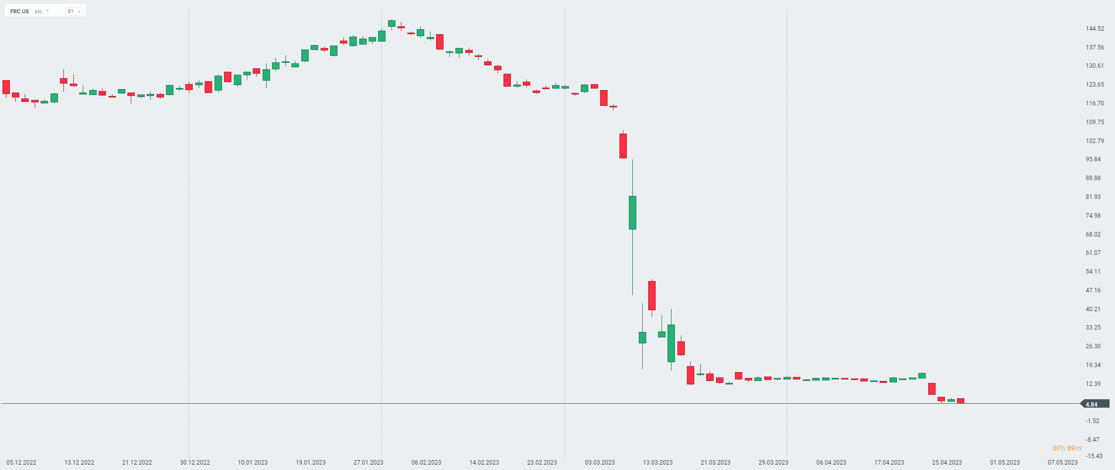 Mimo wczesnych informacji o możliwych rozmowach w celu wsparcia borykającego się z problemami First Republic Bank FRC.US) najnowsze komunikaty agencji CNBC sugerują, że Bank najprawdopodobniej złoży wniosek o niewypłacalności. Akcje banku tracą w chwili obecnej blisko 19%.