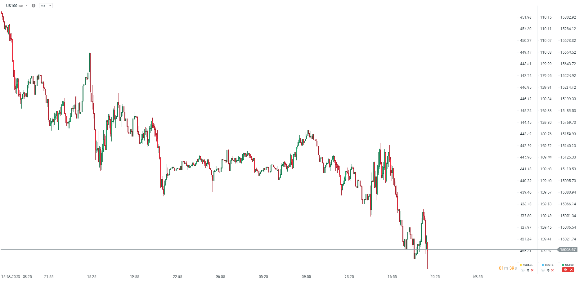 Rynek odczytuje minutes jako jastrzębie, dające podstawę do kontynuacji podwyżek. US100 spada już poniżej 15000 punktów.