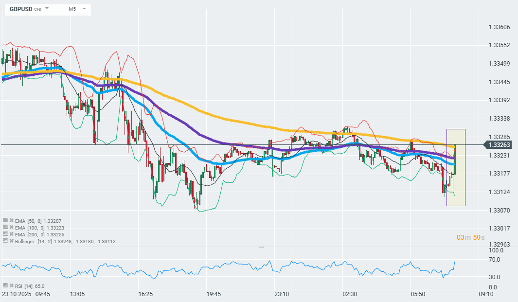 Wyższa aktywność w gospodarce może teoretycznie zniechęcać BoE do szybkich cięć stóp procentowych wobec ryzyka odbicia inflacji, dlatego też funt traci na chwile po publikacji raportu.