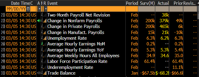 Bardzo duże rewizje poprzednich odczytów oraz świetne odczyty za luty. Spory spadek zatrudnienia w sektorze rządowym na poziomie 86 tys., ale bez znaczenia przy tak dużym wzroście zatrudnienia. Liczba miejsc pracy w sektorze przemysłowym również do góry. Płace zgodnie z oczekiwaniami. Źródło: Bloomberg