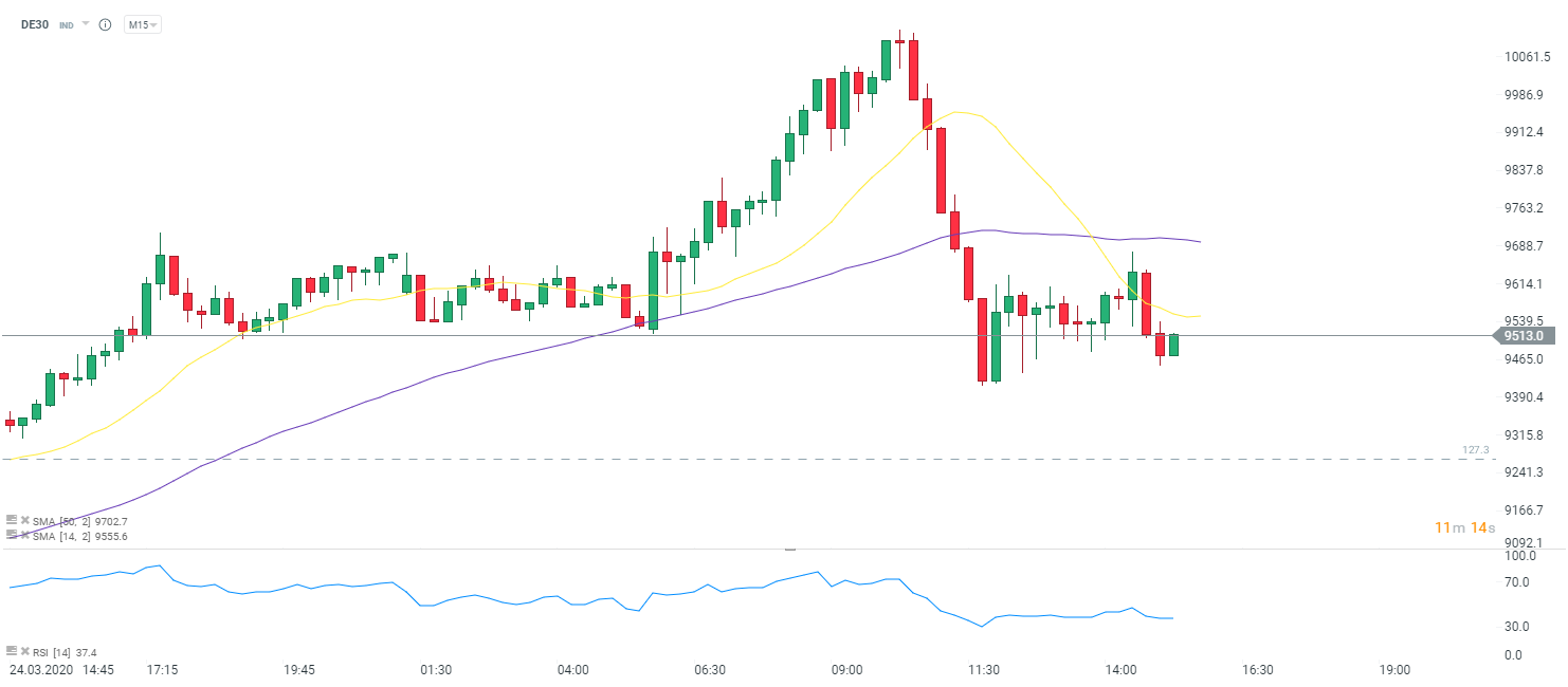 DAX przez poprzednie pół godziny tracił. Obecnie widać jednak próbę powrotu powyżej 9500 punktów. Źródło: xStation5