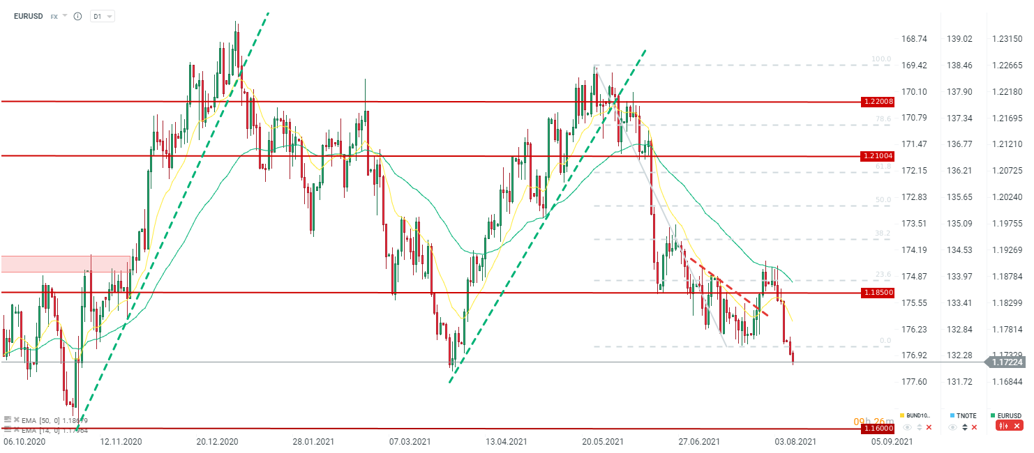 Dolar lekko traci po samym odczycie, co pozwala nieznacznie zminimalizować straty. Niemniej para EURUSD zbliża się do lokalnych minimów z marca oraz poziomu 1,1700. Źródło: xStation5