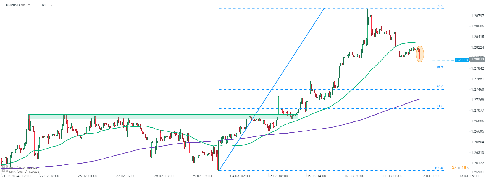 GBPUSD spada w okolice 1,2800 po publikacji gołębich danych o zatrudnieniu z Wielkiej Brytanii. Źródło: xStation5