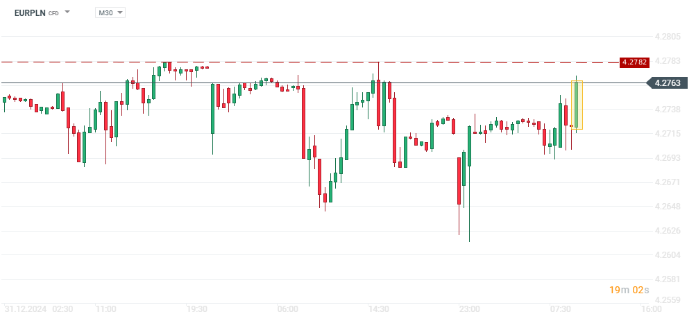 W reakcji na dane widzimy skokowe umocnienie się euro w stosunku do złotego, a para EURPLN zbliża się do lokalnej strefy oporu, w krótkim terminie wyznaczonej przez poziom 4,2782.