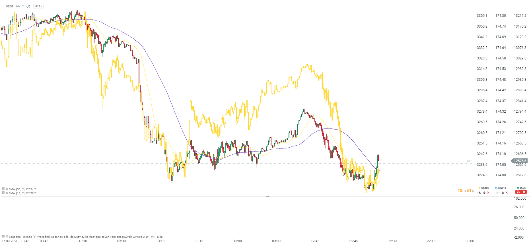 Mimo to niemiecki DAX w ostatnich kilkudziesięciu minutach zalicza spore odbicie. Wzrosty zaczęły się tuż przed rozpoczęciem sesji kasowej i obecnie wynoszą ponad 150 punktów. Jak widać na kontraktach na Wall Street nie mieliśmy tak silnego ruchu, choć z drugiej strony US500 spadał mocniej wczorajszego dnia.
