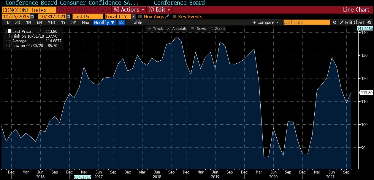Przed chwilą poznaliśmy odczyt indeksu zaufania konsumentów - Conference Board za wrzesień. Oczekiwania przewidywały nieznaczny spadek do poziomu 108,9 pkt. z 109,3 pkt. w sierpniu 2021. Odczyt wypadł lepiej od oczekiwań - indeks wyniósł 113,8 pkt.