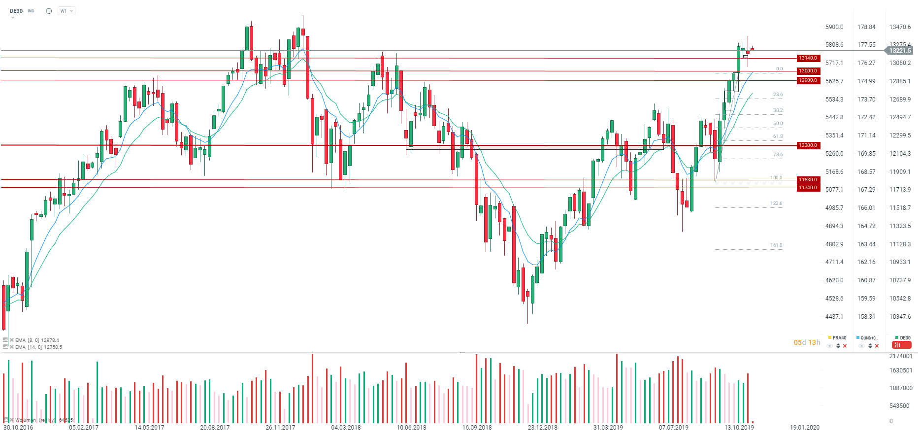 Niemiecki DAX rozpoczyna mieszanie ten tydzień. Po początkowych wzrostach obserwujemy cofnięcie do okolic otwarcia całego zeszłego tygodnia. Kluczowe wsparcie przy okolicach 13200 punktów. Źródło: xStation5