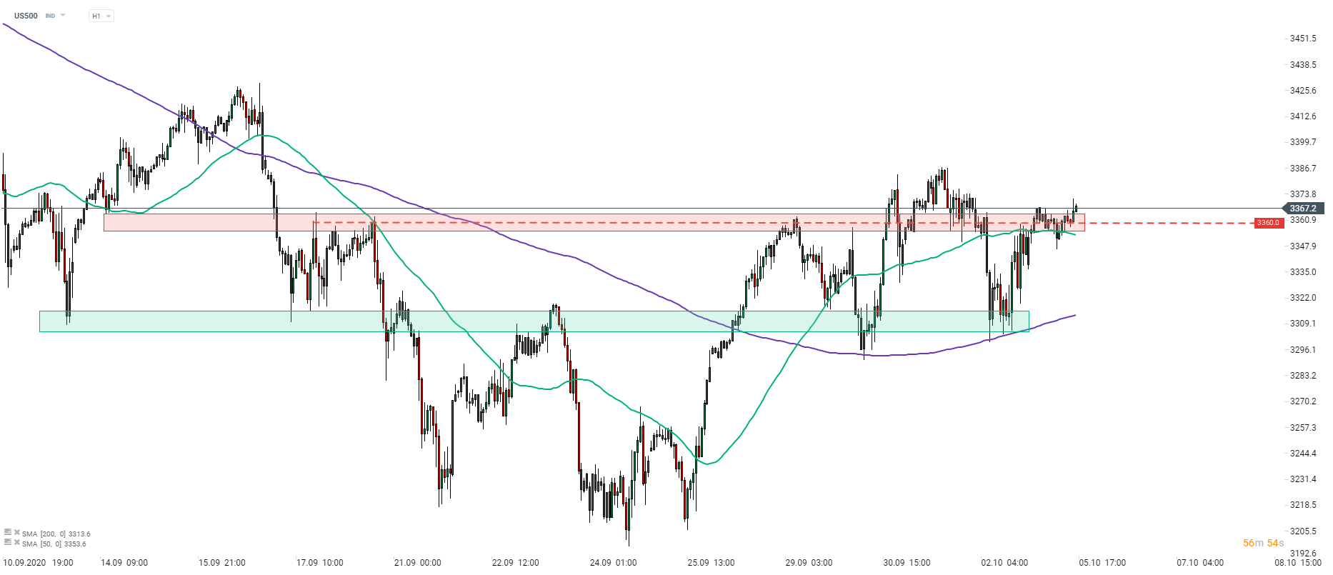 US500 zyskuje po publikacji indeksu ISM dla usług za wrzesień. Indeks stara się oddalić od strefy przy poziomie 3 360 pkt. Źródło: xStation5