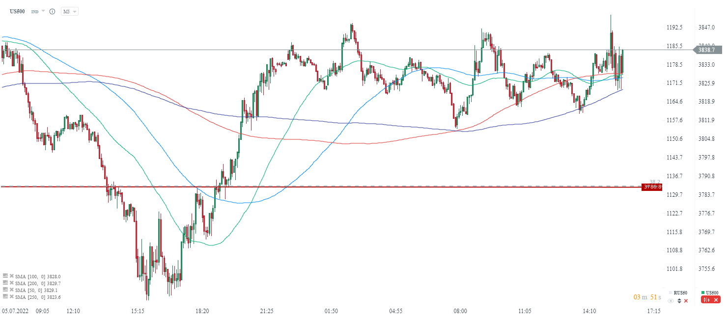 US500 nie reaguje nadmienie, ale pozytywnie. Na te przynajmniej kilka chwil recesja jest odwołana, ale jeśli problemy na rynku pracy pojawią się zgodnie z sygnałem, recesja może nadejść jeszcze szybciej niż oczekiwano. Technicznie kluczowy opór w okolicach 3850 punktów. Źródło: xStation5