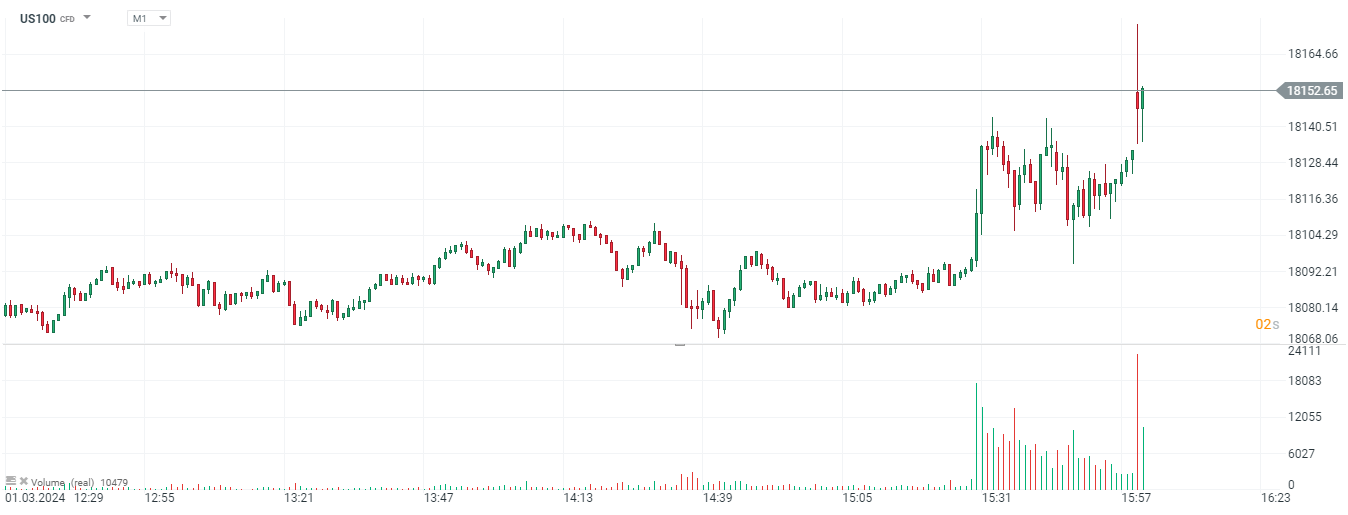 Po danych dolar wymazuje część wzrostów i cofnięcie obserwujemy także na kontaktach, gdzie przeważać zaczął wolumen podażowy. Odczyty nie wydają się jednak jednoznacznie negatywne dla rynku akcji i zwiększają szanse na cięcia w połowie roku, choć warto podkreślić, że stoją poniekąd w sprzeczności do finalnych odczytów S&P PMI przemysłu, za luty.