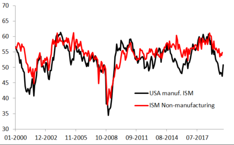 Styczniowy ISM dla przemysłu w górę (dane z sektora usług poznamy w środę). Źródło: Macrobond, XTB Research
