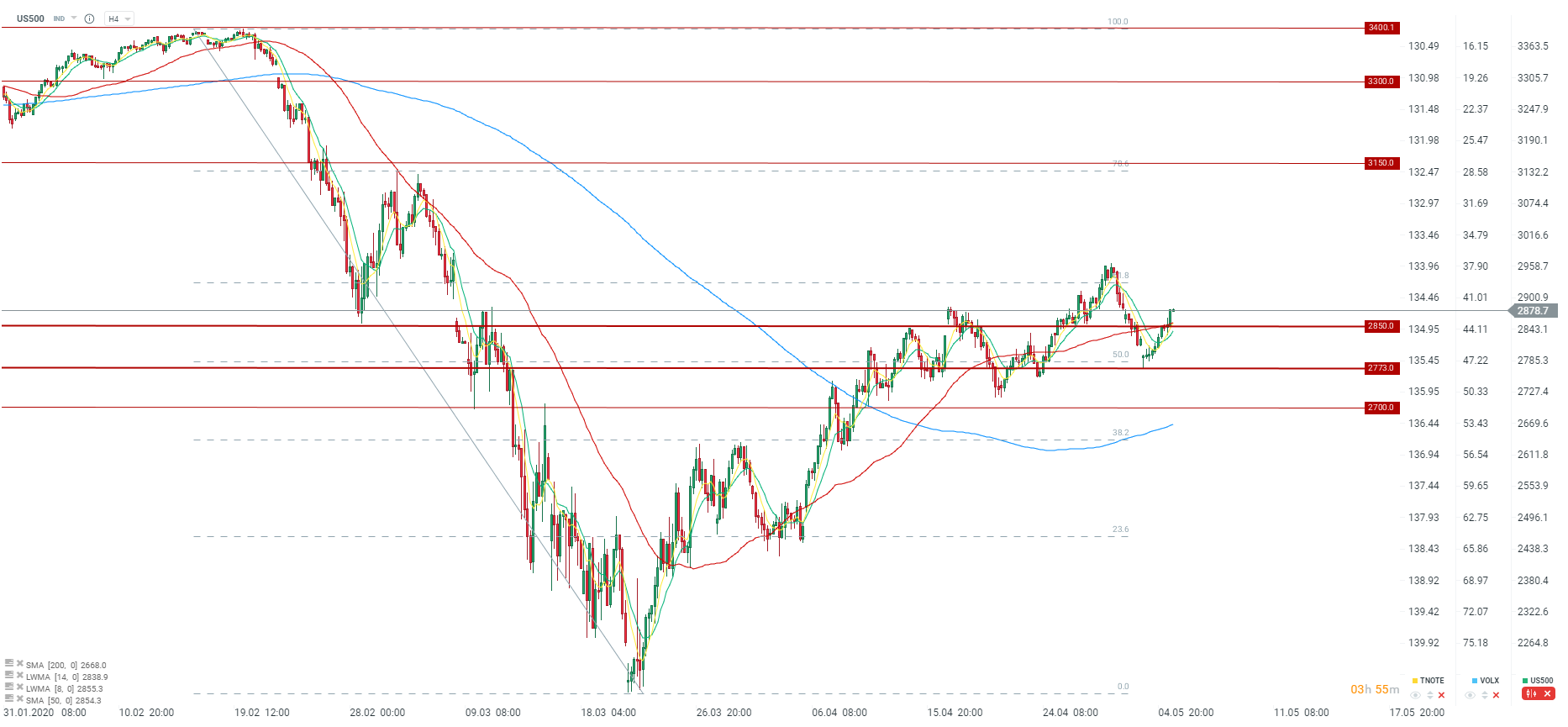 Bariera przy której US500 może napotkać podaż to okolice 2900 punktów oraz następnie ostatnie szczyty przy 2950. Źródło: xStation5