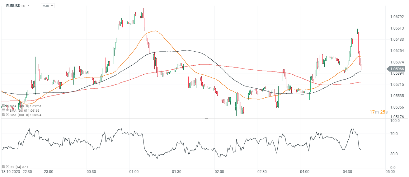 EURUSD jest dziś wyprzedawane od blisko kilku godzin a dzisiejsze publikajce makro z USA rynek odczytuje jako sygnał silniejszego konsumenta o czym świadczy nie tylko indeks CB ale także poprzednie dane z rynku nieruchomości S&P Case/Schiller czy wyższe koszty zatrudnienia. Odczyty stawiają jednak znak zapytania raczej nad decyzją Fed w grudniu niż tą, którą poznamy jutro - utrzymanie stóp bez zmian wydaje się wciąż bazowym scenariuszem.