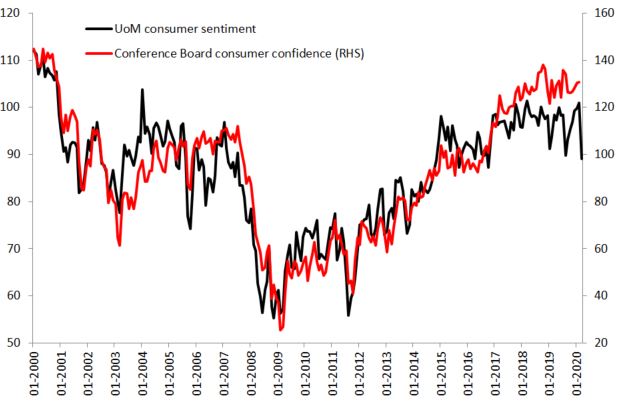 O godzinie 15:00 poznaliśmy kolejne kiepskie dane z USA. Indeks Uniwersytetu Michigan wypadł na poziomie 89.1 pkt., podczas gdy oczekiwania kształtowały się na poziomie 90 pkt. (poprzednio: 101 pkt.). Spadły także oczekiwania co do inflacji w krótkim (2,2%) i długim (2,2%) terminie, zakładały one odpowiednio 2,4% i 2,3%. W pierwszej reakcji po danych obserujemy słabośc dolara.