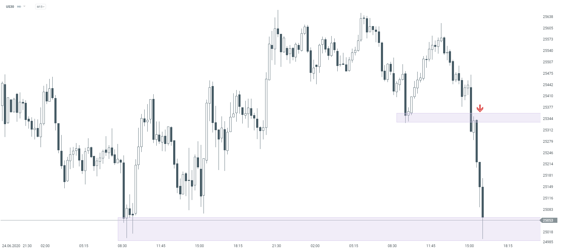 US30 dociera do poziomu wczorajszych minimów przy 25000 pkt. Źródło: xStation5