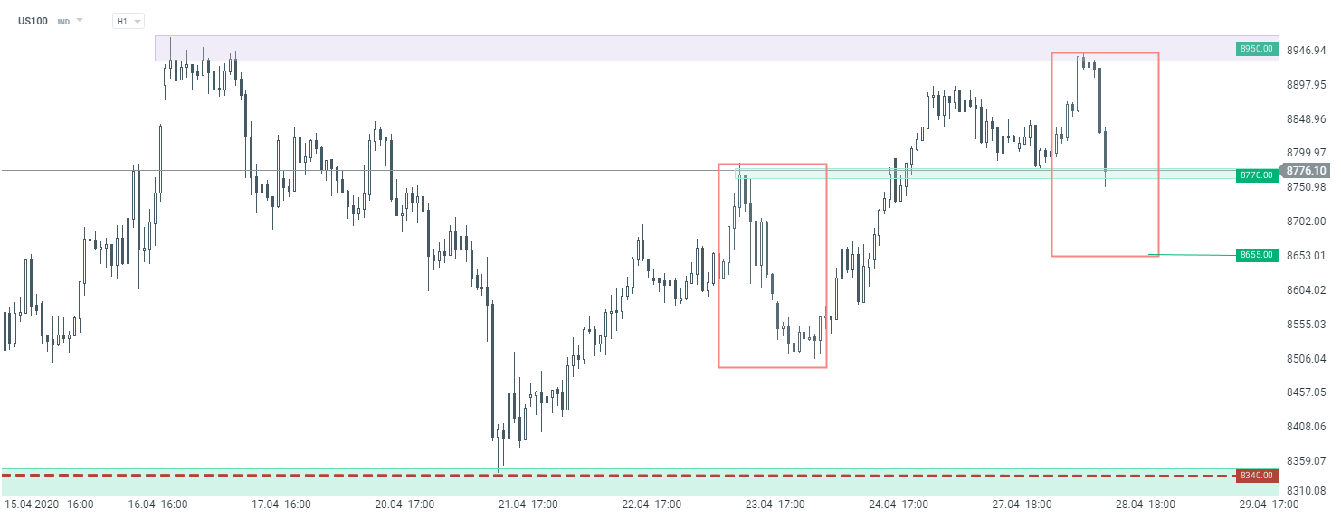 W odpowiedzi na te dane możemy obserwować cofnięcie na rynku akcji. Pomimo, że handel rozpoczął się na wyższych poziomach, tak po godzinie 16:00 przeważają sprzedający. Indeks US100 wymazuje poranne wzrosty. Na interwale H1 można dostrzec szeroką formację podwójnego szczytu, sprzedający pojawili się na wysokości maksimów z 17 kwietnia. Aktualnie testowana jest lokalna strefa sekwencji. jeżeli dojdzie do jej wybicia, możliwy będzie atak na poziom 8655 pkt.