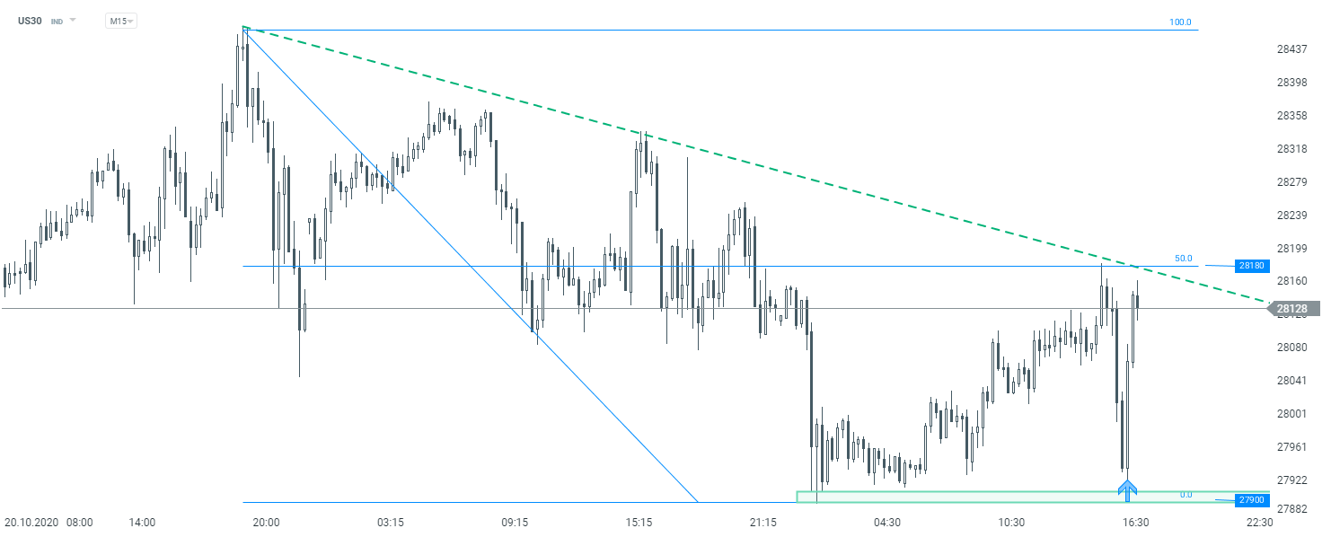 Patrząc technicznie na US30, notowania zbliżają się do lokalnego oporu wynikającego z linii poprowadzonej po ostatnich szczytach oraz mierzenia 50% Fibonacciego ostatniej fali spadkowej (28180 pkt). Jeżeli poziom ten zostanie pokonany, ruch w górę może przyspieszyć. W przeciwnym razie niewykluczone jest ponowne zejście w okolice poziomu 27900 punktów.
