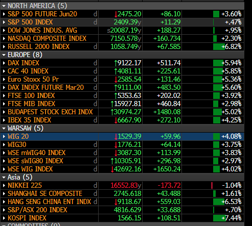 Praktycznie na całym rynku giełdowym widać dzisiaj próbę wyraźnego odbicia. Wzrosty sięgają nawet 5-6% na niektórych rynkach i mogą być wiązane z osłabieniem się dolara po zapewnieniu nowych linii swapowych przez Fed dla kolejnych banków centralnych na świecie, w celu utrzymania dolarowej płynności. Tydzień ten może skończyć się bardzo pozytywnie, choć podobna sytuacja wystąpiła w tygodniu poprzednim. Wciąż silnie rośnie liczba przypadków na całym świecie.