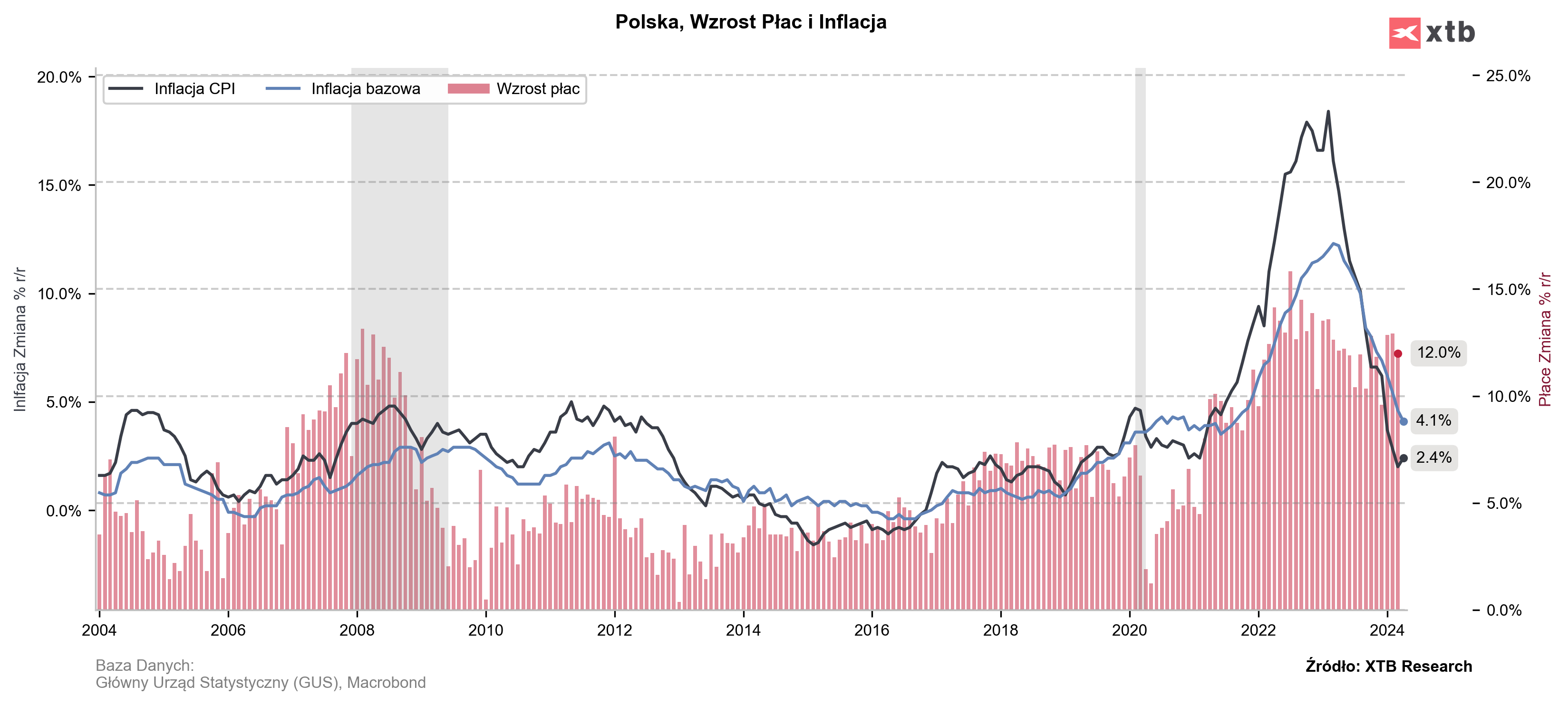 W kwietniu inflacja bazowa w ujęciu rocznym wyniosła w Polsce 4,1% wobec oczekiwań na poziomie 4% i wcześniejszego odczytu na poziomie 4,6%. W ujęciu miesięcznym odczyt wyniósł 0,7% (zgodnie z oczekiwaniami analityków). Poprzednio było to 0,5%.