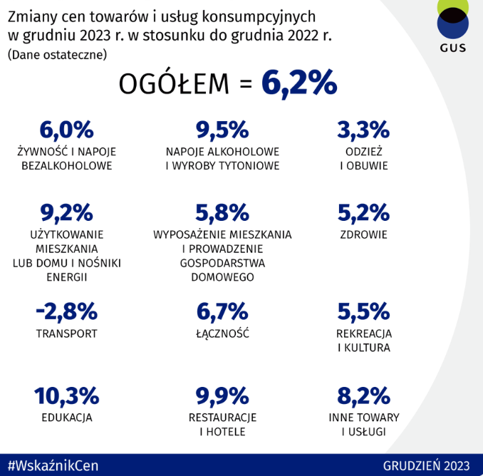Finalny odczyt grudniowej inflacji CPI w Polsce wg. GUS wypadł na poziomie 6,2% wobec 6,1% w pierwszym odczycie i 6,6% w listopadzie.