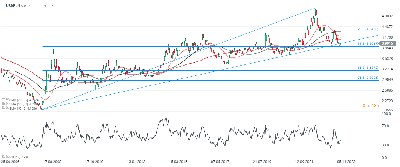Widzimy, że USDPLN próbuje wrócić do linii długoletniego, wzrostowego trendu. Historycznie USDPLN poniżej SMA200 (czerwona linia) okazywał się atrakcyjny, dla długoterminowych inwestorów. Kluczowe dla kontynuacji wzrostów USDPLN może okazać się trwałe przebicie 4 PLN.