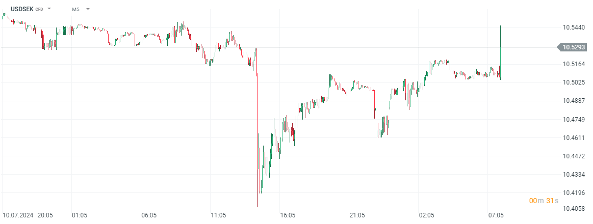 Szwedzka korona osłabia się, a para walutowa USDSEK zyskuje ponad 0,5% i wymazuje niemal całkowicie wczorajsze spadki, napędzane przez słabnącego dolara i dane CPI z USA.