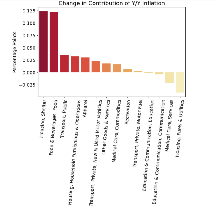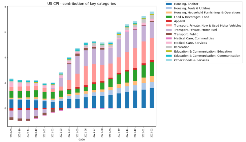 Największy wpływ na wzrost inflacji miały kwestie związane z mieszkaniami (schronieniem), żywnością czy transportem. Co ciekawe, spadły ceny związane z paliwami oraz mediami dla gospodarstw domowych. Można jednak oczekiwać, że te czynniki zostaną zrewidowane w górę lub wzrosną w marcu. Źródło: Macrobond, XTB
