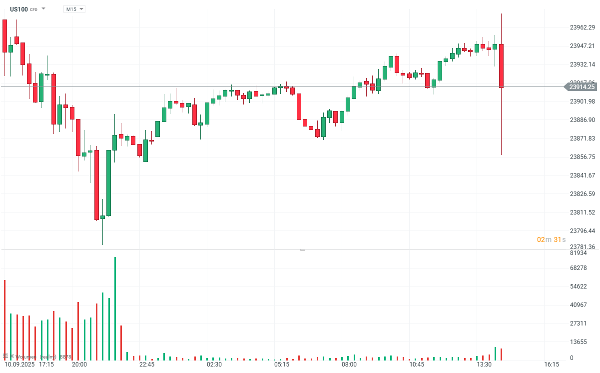 US100 cofnął się po raporcie, a inwestorzy mogą obawiać się, że choć cięcia stóp w Fed dojdą do skutku, gospodarka może spowolnić. Kontrakt prawdopodobnie będzie walczył o powrót powyżej 24,000 punktów