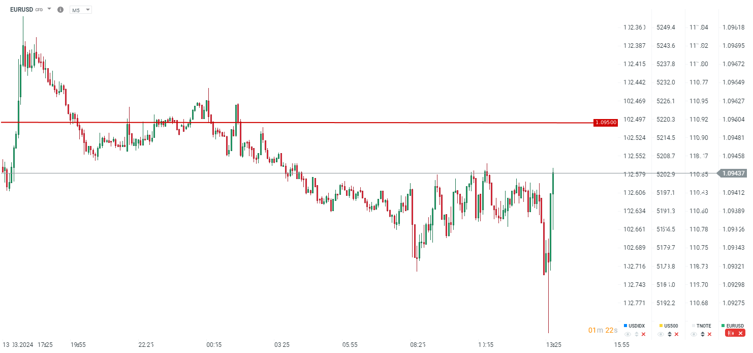 Pierwsza reakcja prawdopodobnie była związana z inflacją. Z drugiej strony poznaliśmy gorsze (choć niezłe) dane dotyczące sprzedaży detalicznej i to prawdopodobnie po tych danych obserwujemy wyraźne odbicie na EURUSD. Źródło: xStation5