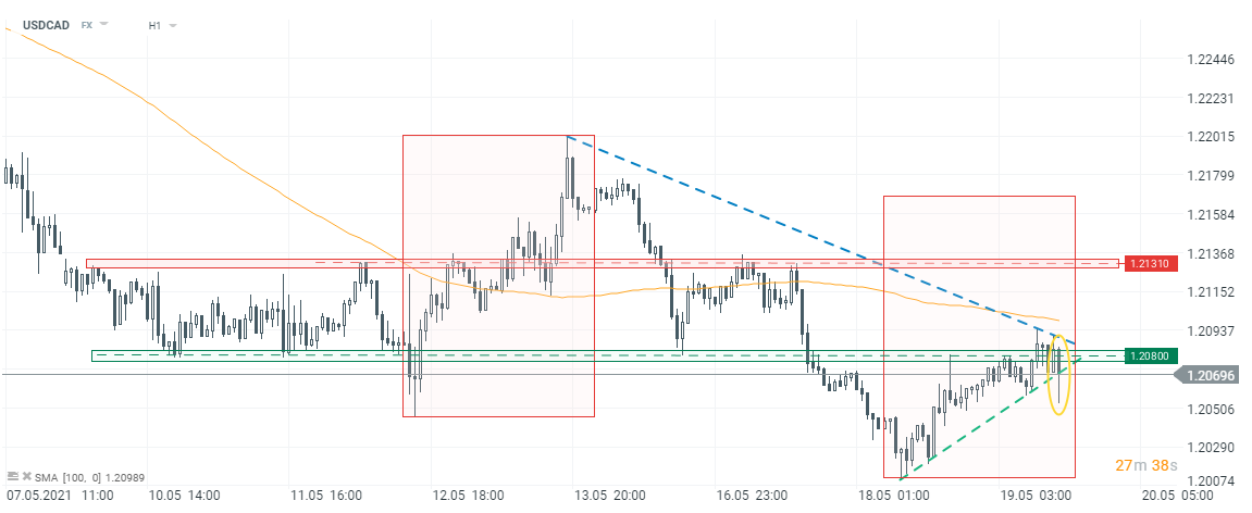 Tuż po publikacji danych CAD umocnił się wobec USD, naruszając linię krótkoterminowego trendu wzrostowego na parze walutowej. Ruch został już jednak zanegowany i kurs powrócił w okolice 1,2075. Źródło: xStation5