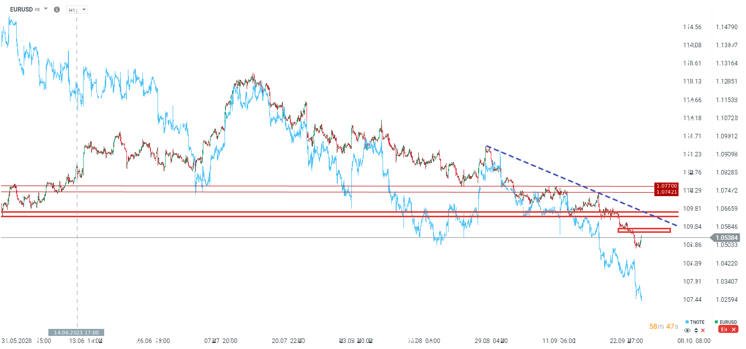 EURUSD minimalnie cofa się po tych danych, choć patrząc na perspektywy inflacji, EBC z pewnością będzie miał trudny orzech do zgryzienia w końcówce roku. TNOTE oczywiście mocno w dół, co daje jeszcze perspektywy do ponownego testu okolic 1,05.