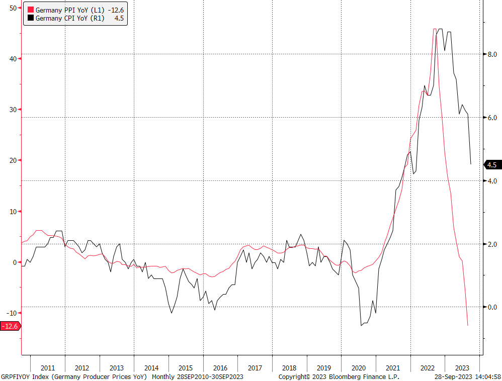Inflacja CPI spada mocniej w ujęciu rocznym za wrzesień. PPI spadła o 12,6% za sierpień. Niemniej ceny producentów powinny w najbliższym czasie odbić, biorąc pod uwagę wyższe ceny ropy naftowej. Źródło: Bloomberg Finance LP