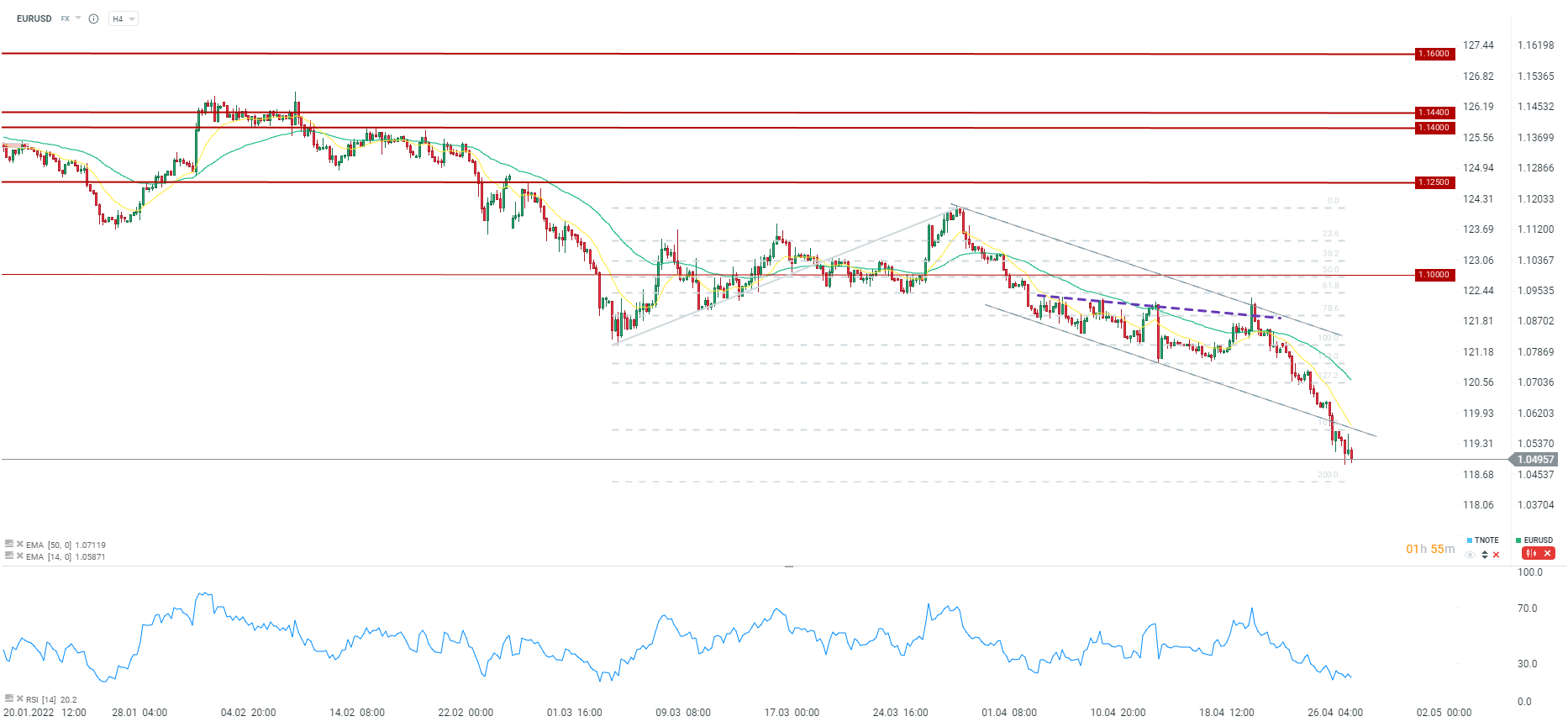 EURUSD kontynuuje spadki. Wyższa inflacja w Niemczech powinna jednak wywierać coraz większą presję na szybsze działania EBC. Źródło: xStation5