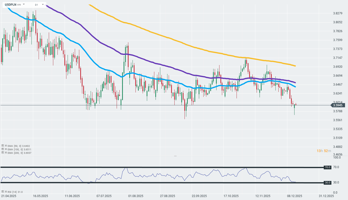 Patrząc na wykres USDJPY widzimy, że nasza waluta pozostaje relatywnie silna do dolara amerykańskiego. Nie jest to jednak kwestia dzisiejszych danych, ale ogólnego trendu spadkowego panującego na takich parach USDPLN, EURPLN i innych.