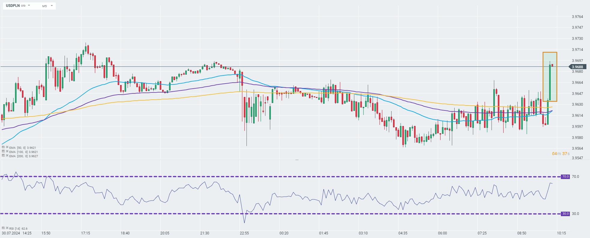 Inflacja w Polsce za lipiec (odczyt wstępny) wypadła poniżej oczekiwań, ale względem czerwcowego odczytu widzimy wyraźne przyspieszenie presji cenowej w kraju. Odczyt r/r wypadł na poziomie .4.2% wobec oczekiwanych 4.4%, a odczyt miesięczny na poziomie 1.4% względem 1.6%. W czerwcu było to odpowiednio 2.6% oraz 0.1%. Polski złoty stracił na wartości po tym odczycie.