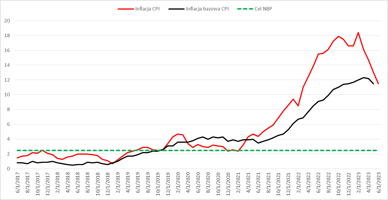 Inflacja w Polsce poniżej oczekiwań! Odczyt na poziomie 11,5% r/r. Konsensus zakładał 11,8% r/r, a miesiąc wcześniej było to 13,0% r/r. Dane miesięczne również zaskakują w dół. Dynamika wzrostu cen dóbr i usług schodzi coraz bliżej bariery 10%, co wzmacnia szansę na gołębi zwrot NBP.
