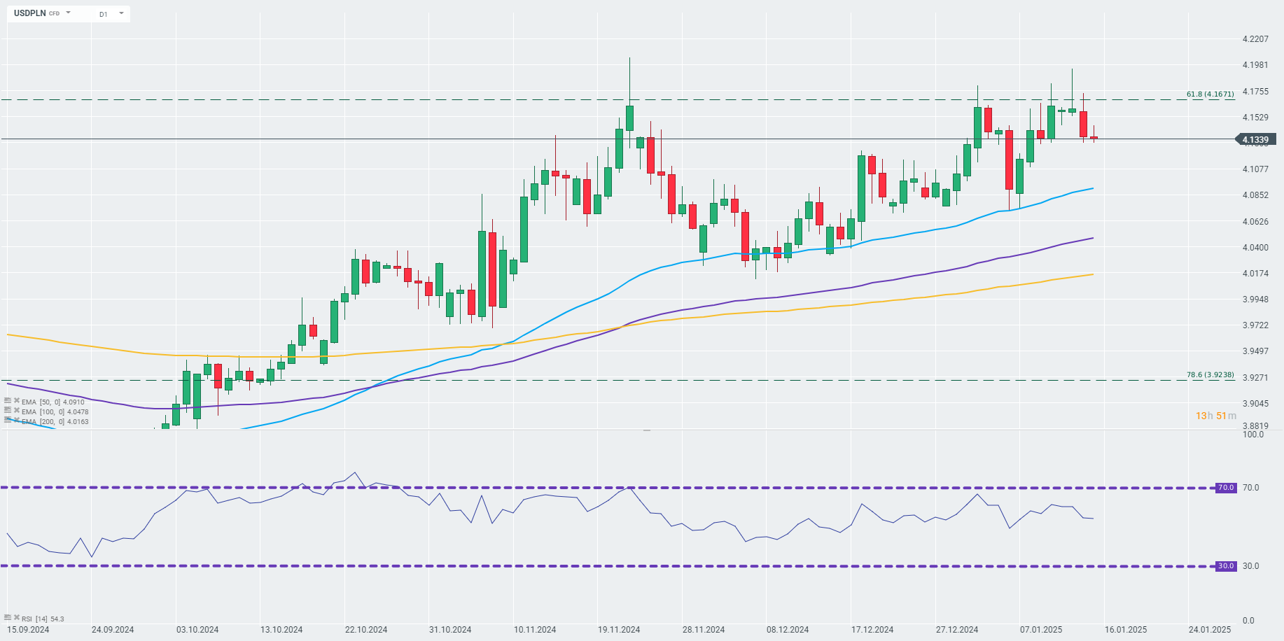 Polski złoty nie zareagował na publikację danych CPI. Para USDPLN traci dzisiaj i notowana jest w strefie 4.1350. Para cały czas jednak utrzymuje stabilny trend wzrostowy.