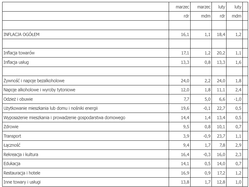 Polska, inflacja CPI za marzec (ostateczna). Obecnie: 16.1% r/r. Pierwszy odczyt: 16.2% r/r. Wcześniej: 18,4% r/r.