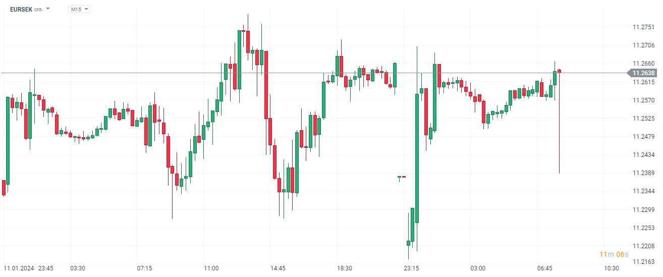 EURSEK osunął się po publikacji, ale straty zostały szybko wymazane. W tym samym czasie opublikowano dane z Niemiec, gdzie ceny sprzedaży hurtowej okazały się niższe o 2,6% wobec -3,6% spadku poprzednio. Dynamika spadkowa m/m została zachowana, odczyt wskazał -0,6% m/m wobec -0,2% poprzednio
